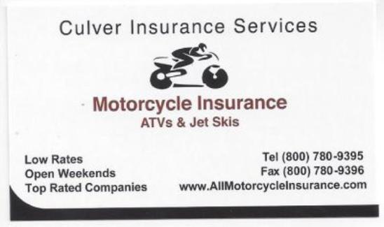 | Insurance: We recommend Culver Insurance for all of your Motorcycle insurance needs- Fast service and good rates. Tell them we sent you! |